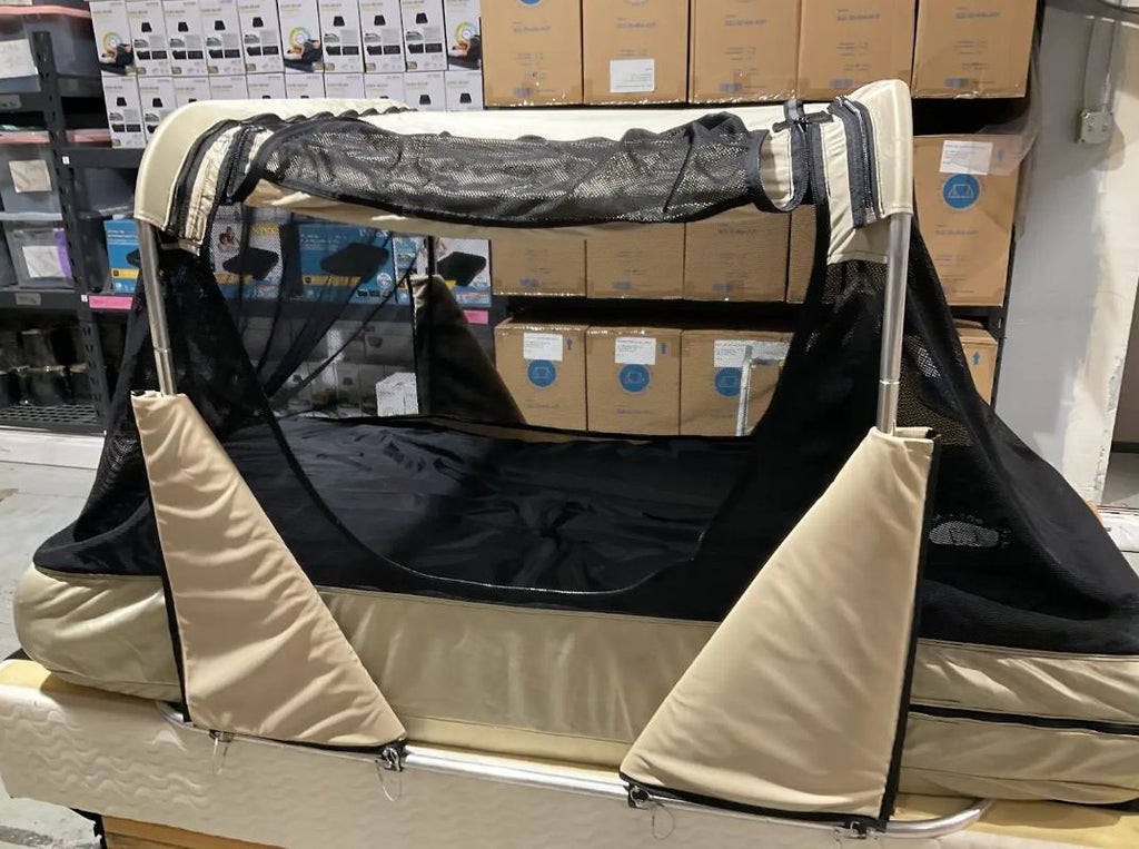 - Aesthetic issues include some sagging on the mesh and a small stain on the top of the enclosure